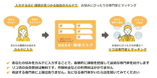 家族のカタチが多様化する時代に、新しい情報や価値観をシェアし、離婚や夫婦問題に多くの実績を持つ専門家とのマッチングで、悩みに寄り添うアドバイスを提供します。離婚や夫婦問題で悩む全ての人の悩みに寄り添い、課題を解決し幸せに向かう再出発をしてほしいという思いから、「リコ活」(https://ricokatsu.com/)を立ち上げました。